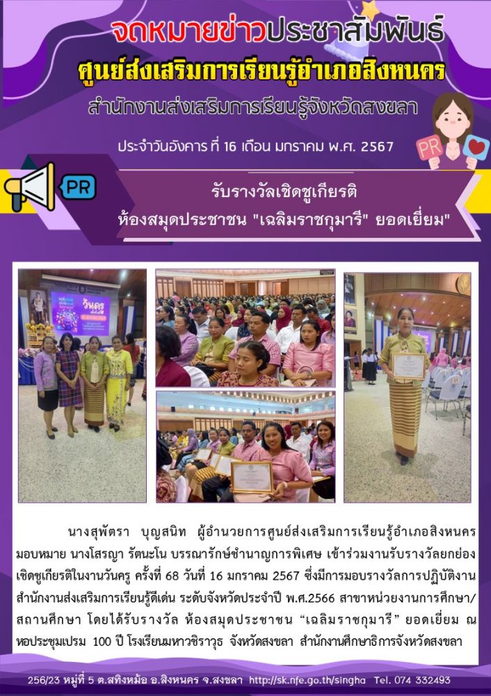 รับรางวัลเชิดชูเกียรติ ห้องสมุดประชาชน \"เฉลิมราชกุมารี\" ยอดเยี่ยม\"