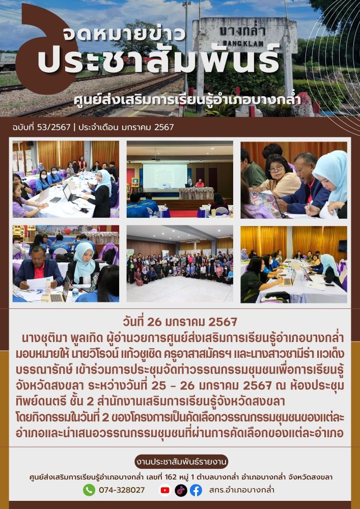 ศูนย์ สกร.ระดับอำเภอบางกล่ำ วันที่ 26 มกราคม 2567 ศูนย์ส่งเสริมการเรียนรู้อำเภอบางกล่ำ เข้าร่วมการประชุมจัดทำวรรณกรรมชุมชนเพื่อการเรียนรู้ จังหวัดสงขลา ระหว่างวันที่ 25 - 26 มกราคม 2567 ณ ห้องประชุมทิพย์ดนตรี ชั้น 2 สำนักงานเสริมการเรียนรู้จังหวัดสงขลา
