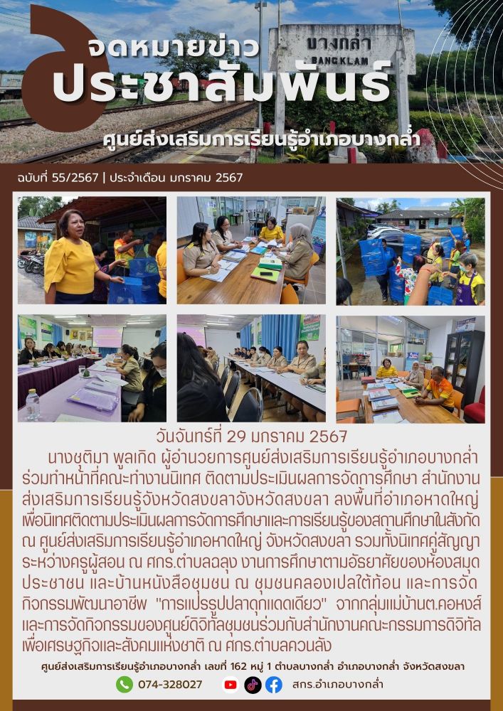 ศูนย์ สกร.ระดับอำเภอบางกล่ำ วันจันทร์ที่ 29 มกราคม 2567 นางชุติมา พูลเกิด ผู้อำนวยการศูนย์ส่งเสริมการเรียนรู้อำเภอบางกล่ำ ร่วมทำหน้าที่คณะทำงานนิเทศ ติดตามประเมินผลการจัดการศึกษา สำนักงาน ส่งเสริมการเรียนรู้จังหวัดสงขลาจังหวัดสงขลา ลงพื้นที่อำเภอหาดใหญ่