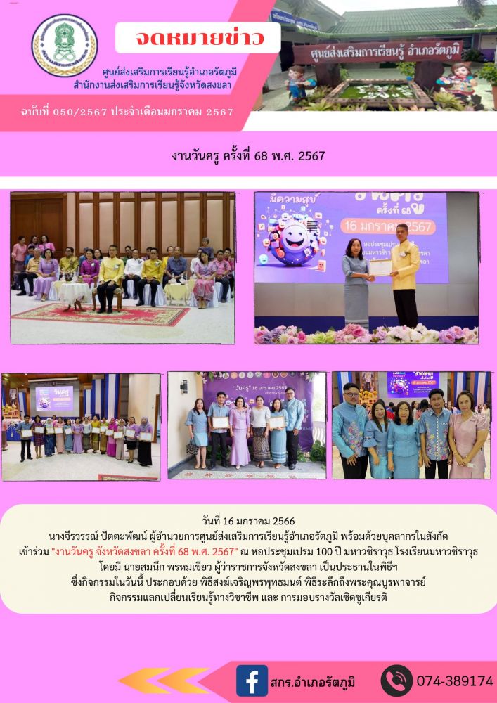 งานวันครู จังหวัดสงขลา ครั้งที่ 68 พ.ศ. 2567\" ณ หอประชุมเปรม 100 ปี มหาวชิราวุธ โรงเรียนมหาวชิราวุธ