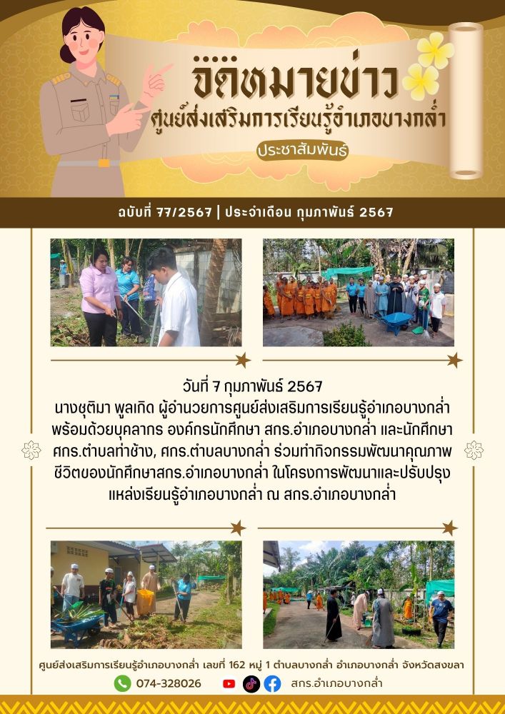 ศูนย์ สกร.ระดับอำเภอบางกล่ำ วันที่ 7 กุมภาพันธ์ 2567 ศูนย์ส่งเสริมการเรียนรู้อำเภอบางกล่ำ ผู้บริหาร พร้อมด้วยบุคลากร องค์กรนักศึกษา สกร.อำเภอบางกล่ำ และนักศึกษา ศกร.ตำบลท่าช้าง, ศกร.ตำบลบางกล่ำ ร่วมทำกิจกรรมพัฒนาคุณภาพชีวิตของนักศึกษาสกร.อำเภอบางกล่ำ ในโครงการพัฒนาและปรับปรุงแหล่งเร