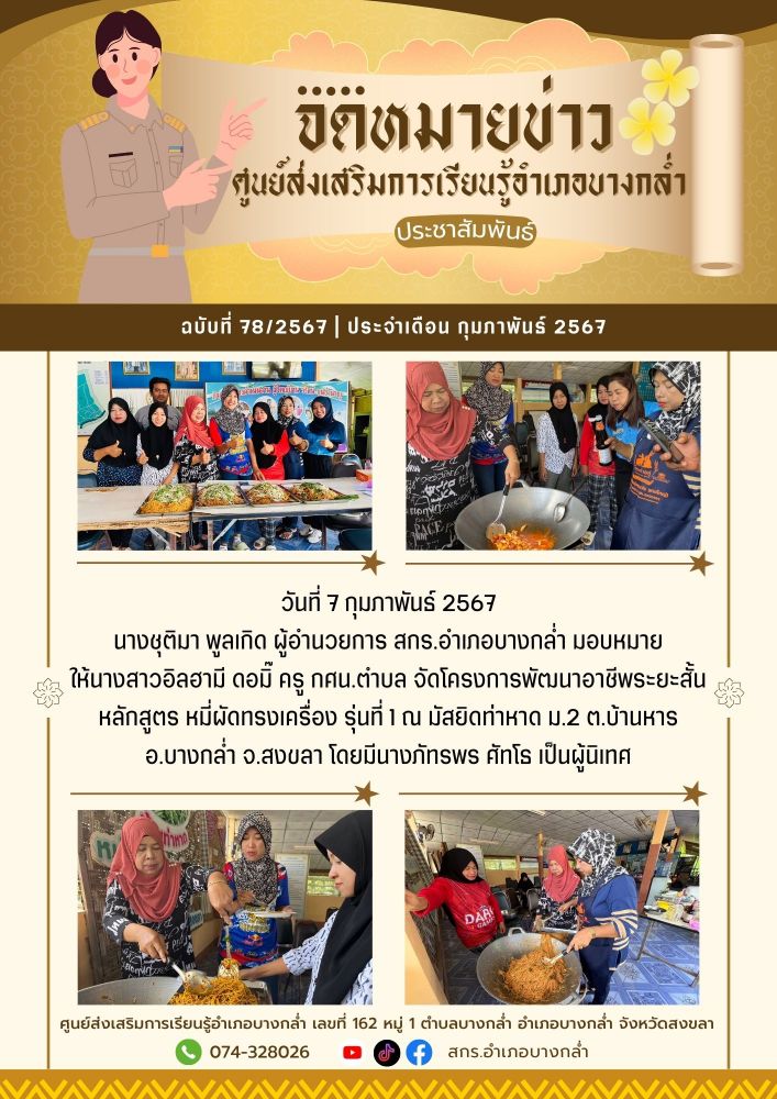 วันที่ 7 กุมภาพันธ์ 2567 สกร.อำเภอบางกล่ำ จัดโครงการพัฒนาอาชีพระยะสั้นหลักสูตร หมี่ผัดทรงเครื่อง รุ่นที่ 1 ณ มัสยิดท่าหาด ม.2 ต.บ้านหาร