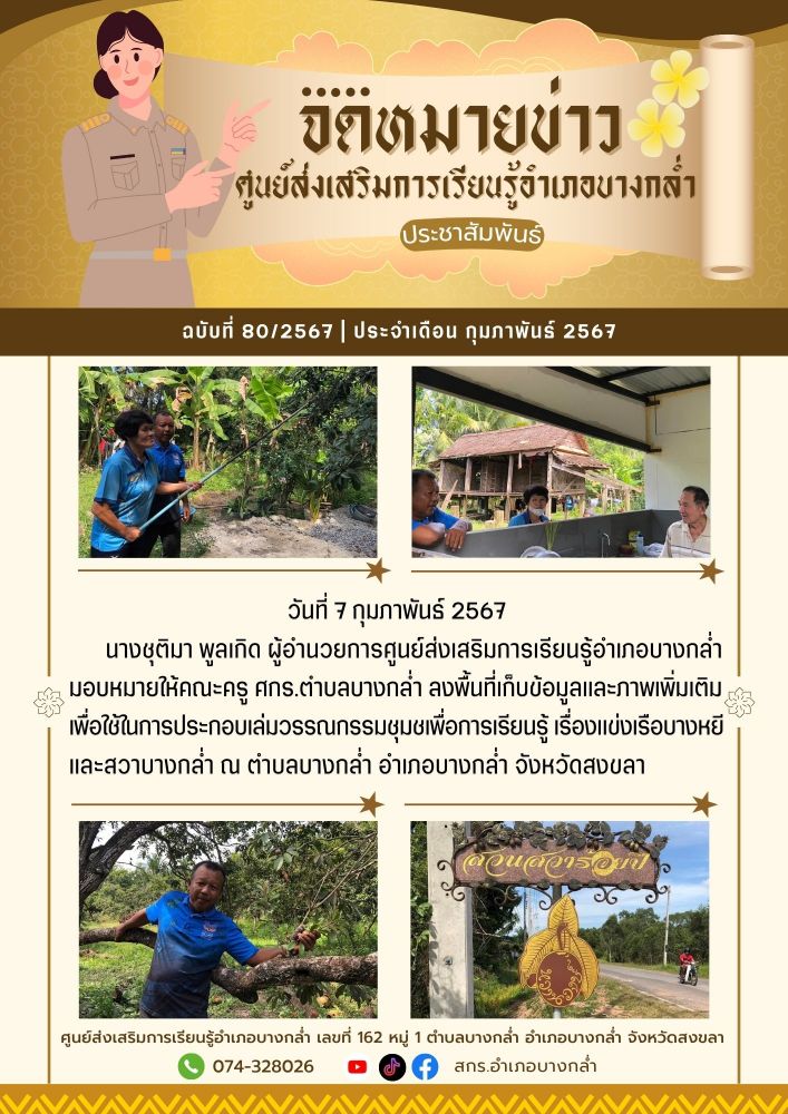 วันที่ 7 กุมภาพันธ์ 2567 คณะครูศกร.ตำบลบางกล่ำ ลงพื้นที่เก็บข้อมูลและภาพเพิ่มเติม เพื่อใช้ในการประกอบเล่มวรรณกรรมชุมชเพื่อการเรียนรู้