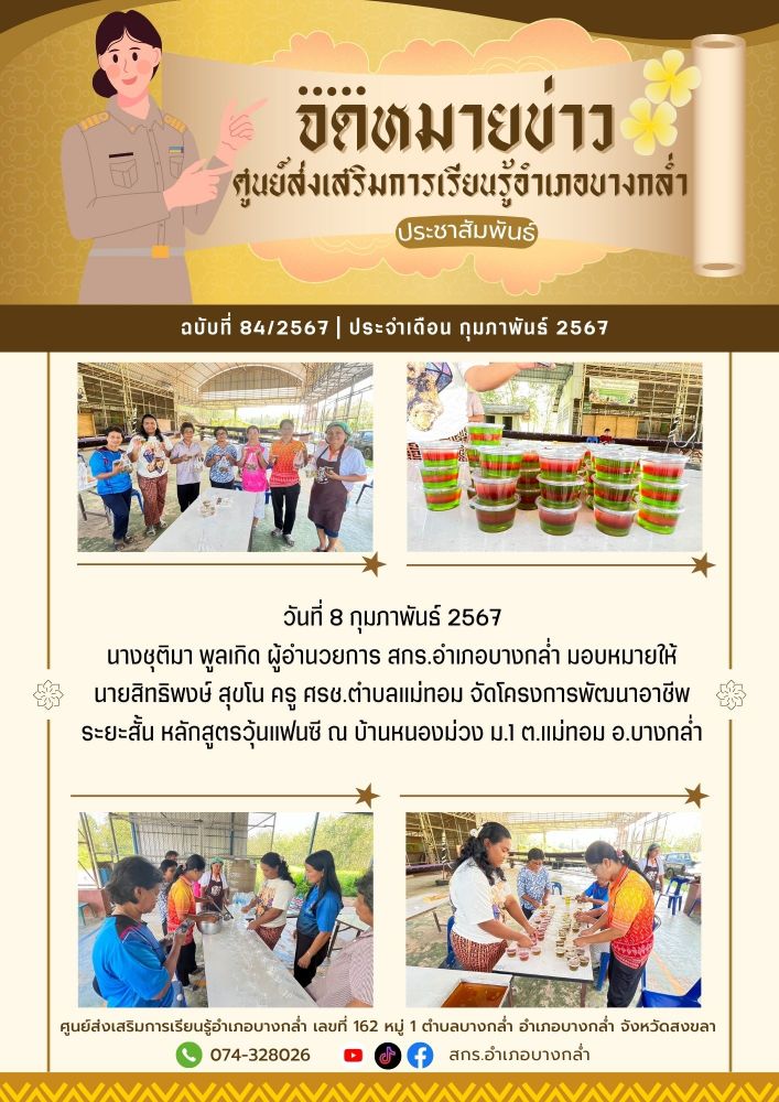 วันที่ 8 กุมภาพันธ์ 2567 นายสิทธิพงษ์ สุขโน ครู ศรช.ตำบลแม่ทอม จัดโครงการพัฒนาอาชีพ ระยะสั้น หลักสูตรวุ้นแฟนซี ณ บ้านหนองม่วง ม.1 ต.แม่ทอม
