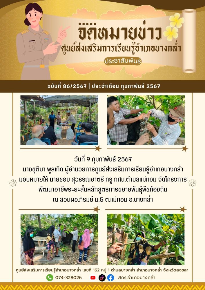 วันที่ 9 กุมภาพันธ์ 2567 นายชอบ สุวรรณชาตรี ครู กศน.ตำบลแม่ทอม จัดโครงการพัฒนาอาชีพระยะสั้นหลักสูตรการขยายพันธุ์พืชท้องถิ่น ณ สวนผอ.ภิรมย์ ม.5 ต.แม่ทอม