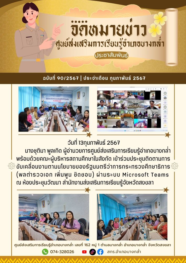 ศูนย์ สกร.ระดับอำเภอบางกล่ำ วันที่ 13กุมภาพันธ์ 2567 นางชุติมา พูลเกิด ผู้อำนวยการศูนย์ส่งเสริมการเรียนรู้อำเภอบางกล่ำ พร้อมด้วยคณะผู้บริหารสถานศึกษาในสังกัด เข้าร่วมประชุมติดตามการ ขับเคลื่อนงานตามนโยบายของรัฐมนตรีว่าการกระทรวงศึกษาธิการ (พลตำรวจเอก เพิ่มพูน ชิดชอบ) ผ่านระบบ Micro