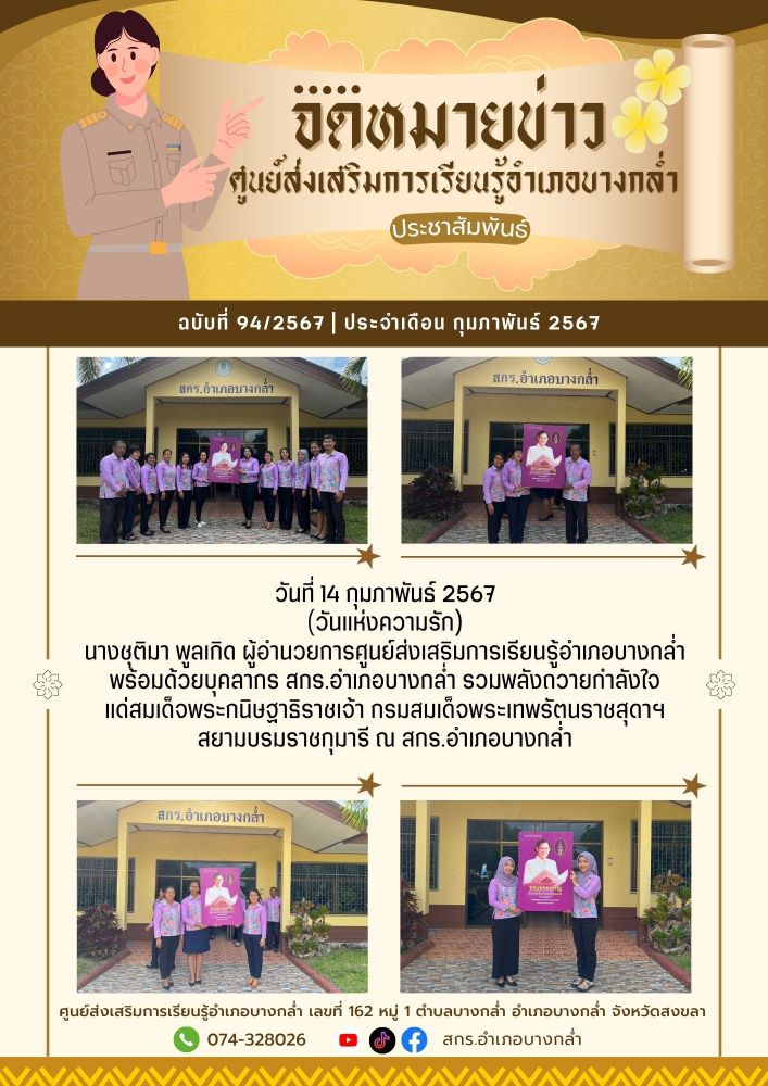 ศูนย์ สกร.ระดับอำเภอบางกล่ำ วันที่ 14 กุมภาพันธ์ 2567 (วันแห่งความรัก) นางชุติมา พูลเกิด ผู้อำนวยการศูนย์ส่งเสริมการเรียนรู้อำเภอบางกล่ำ พร้อมด้วยบุคลากร สกร.อำเภอบางกล่ำ รวมพลังถวายกำลังใจ แด่สมเด็จพระกนิษฐาธิราชเจ้า กรมสมเด็จพระเทพรัตนราชสุดาฯ สยามบรมราชกุมารี ณ สกร.อำเภอบางกล่