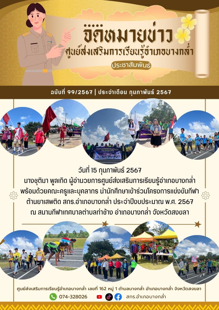 ศูนย์ สกร.ระดับอำเภอบางกล่ำ วันที่ 15 กุมภาพันธ์ 2567 นางชุติมา พูลเกิด ผู้อำนวยการศูนย์ส่งเสริมการเรียนรู้อำเภอบางกล่ำ พร้อมด้วยคณะครูและบุคลากร นำนักศึกษาเข้าร่วมโครงการแข่งขันกีฬาต้านยาเสพติด สกร.อำเภอบางกล่ำ ประจำปีงบประมาณ พ.ศ. 2567