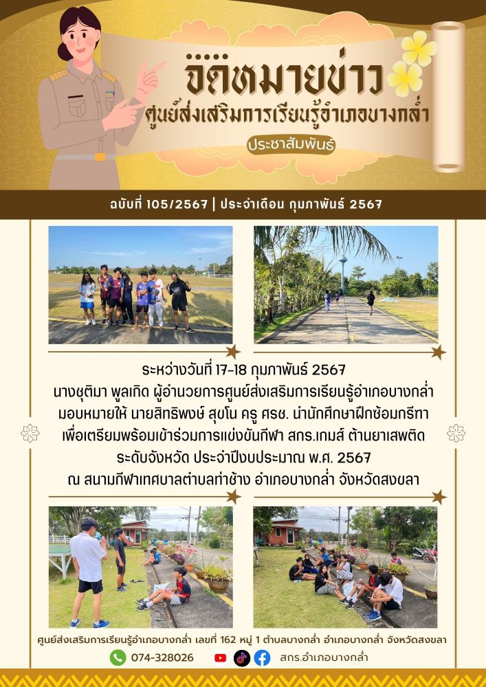 ระหว่างวันที่ 17-18 กุมภาพันธ์ 2567 นางชุติมา พูลเกิด ผู้อำนวยการศูนย์ส่งเสริมการเรียนรู้อำเภอบางกล่ำ มอบหมายให้ นายสิทธิพงษ์ สุขโน ครู ศรช. นำนักศึกษาฝึกซ้อมกรีฑา