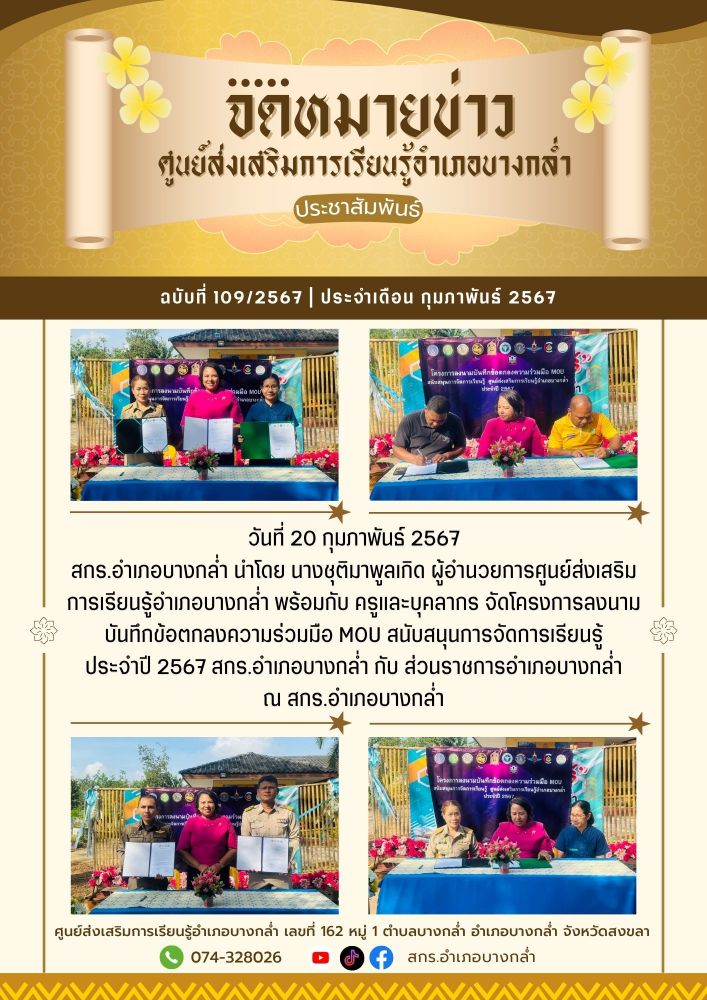 ศูนย์ สกร.ระดับอำเภอบางกล่ำ วันที่ 20 กุมภาพันธ์ 2567 สกร.อำเภอบางกล่ำ นำโดย นางชุติมาพูลเกิด ผู้อำนวยการศูนย์ส่งเสริมการเรียนรู้อำเภอบางกล่ำ พร้อมกับ ครูและบุคลากร จัดโครงการลงนามบันทึกข้อตกลงความร่วมมือ MOU สนับสนุนการจัดการเรียนรู้ ประจำปี 2567 สกร.อำเภอบางกล่ำ กับ ส่วนราชการอำเ