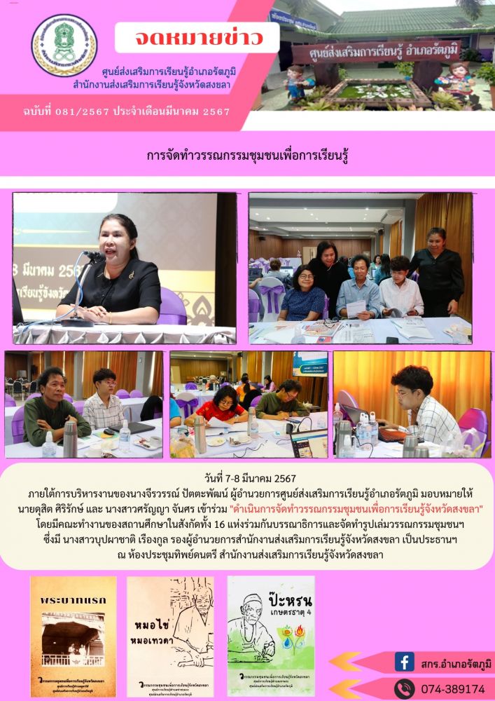 ดำเนินการจัดทำวรรณกรรมชุมชน โดยมีคณะทำงานการจัดทำวรรณกรรมชุมชนเพื่อการเรียนรู้จังหวัดสงขลา