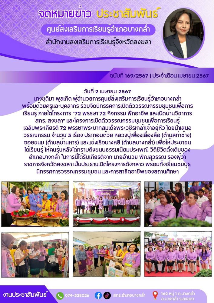 ศูนย์ สกร.ระดับอำเภอบางกล่ำ ร่วมจัดนิทรรศการเปิดตัววรรณกรรมชุมชนเพื่อการเรียนรู้ ภายใต้โครงการ 72 พรรษา 72 กิจกรรม ฝึกอาชีพ และเปิดบ้านวิชาการ สกร. สงขลา และโครงการเปิดตัววรรณกรรมชุมชนเพื่อการเรียนรู้