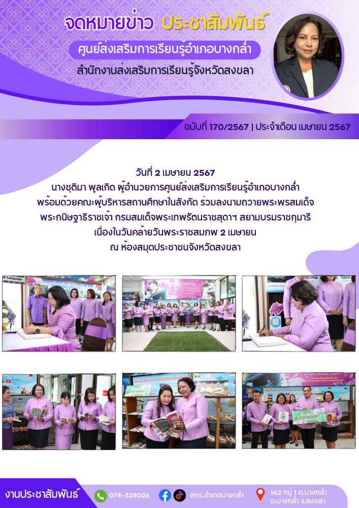 ศูนย์ สกร.ระดับอำเภอบางกล่ำ ผู้อำนวยการศูนย์ส่งเสริมการเรียนรู้อำเภอบางกล่ำ พร้อมด้วยคณะผู้บริหารสถานศึกษาในสังกัด ร่วมลงนามถวายพระพรสมเด็จพระกนิษฐาธิราชเจ้า กรมสมเด็จพระเทพรัตนราชสุดาฯ สยามบรมราชกุมารี เนื่องในวันคล้ายวันพระราชสมภพ 2 เมษายน
