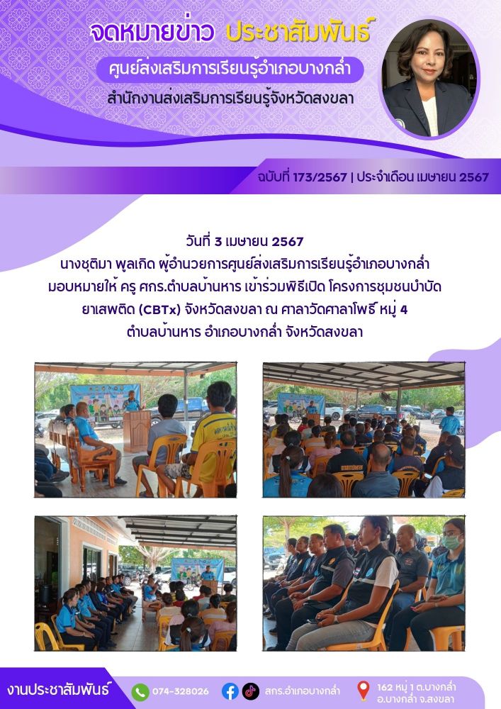 เข้าร่วมพิธีเปิด โครงการชุมชนบำบัดยาเสพติด (CBTx) จังหวัดสงขลา ณ ศาลาวัดศาลาโพธิ์ หมู่ 4 ตำบลบ้านหาร อำเภอบางกล่ำ จังหวัดสงขลา