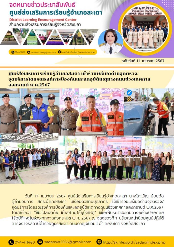 ศูนย์ส่งเสริมการเรียนรู้อำเภอสะเดา เข้าร่วมพิธีเปิดด่านจุดตรวจ/ จุดบริการโดยรณรงค์การป้องกันและลดอุบัติเหตุทางถนนช่วงเทศกาลสงกรานต์ พ.ศ.2567