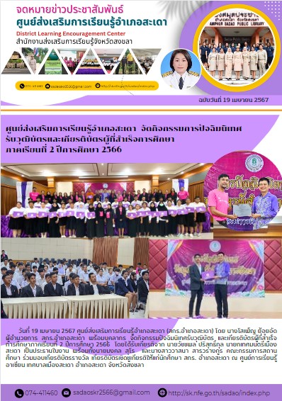 ศูนย์ส่งเสริมการเรียนรู้อำเภอสะเดา จัดกิจกรรมการปัจฉิมนิเทศ รับวุฒิบัตรและเกียรติบัตรผู้ที่สำเร็จการศึกษา ภาคเรียนที่ 2 ปีการศึกษา 2566