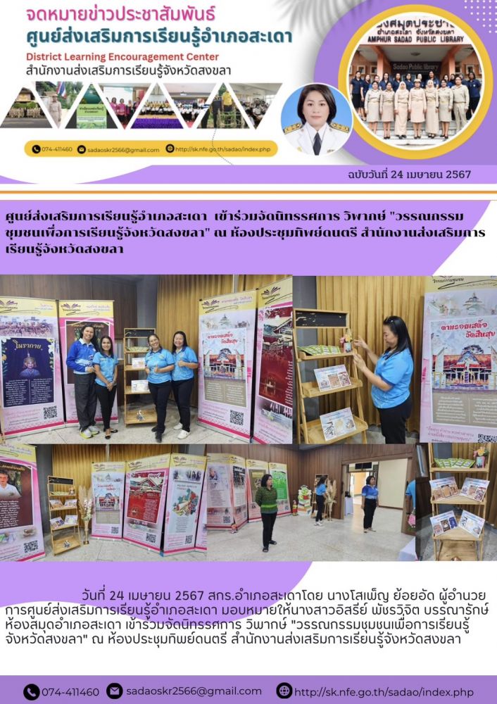 ศูนย์ส่งเสริมการเรียนรู้อำเภอสะเดา เข้าร่วมจัดนิทรรศการ วิพากษ์ \"วรรณกรรมชุมชนเพื่อการเรียนรู้จังหวัดสงขลา\" ณ ห้องประชุมทิพย์ดนตรี สำนักงานส่งเสริมการเรียนรู้จังหวัดสงขลา