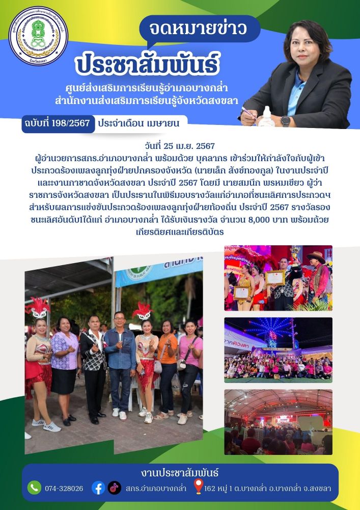 เข้าร่วมให้กำลังใจกับผู้เข้าประกวดร้องเพลงลูกทุ่งฝ่ายปกครองจังหวัด (นายเล็ก สังข์ทองกูล) ในงานประจำปีและะงานกาชาดจังหวัดสงขลา ประจำปี 2567