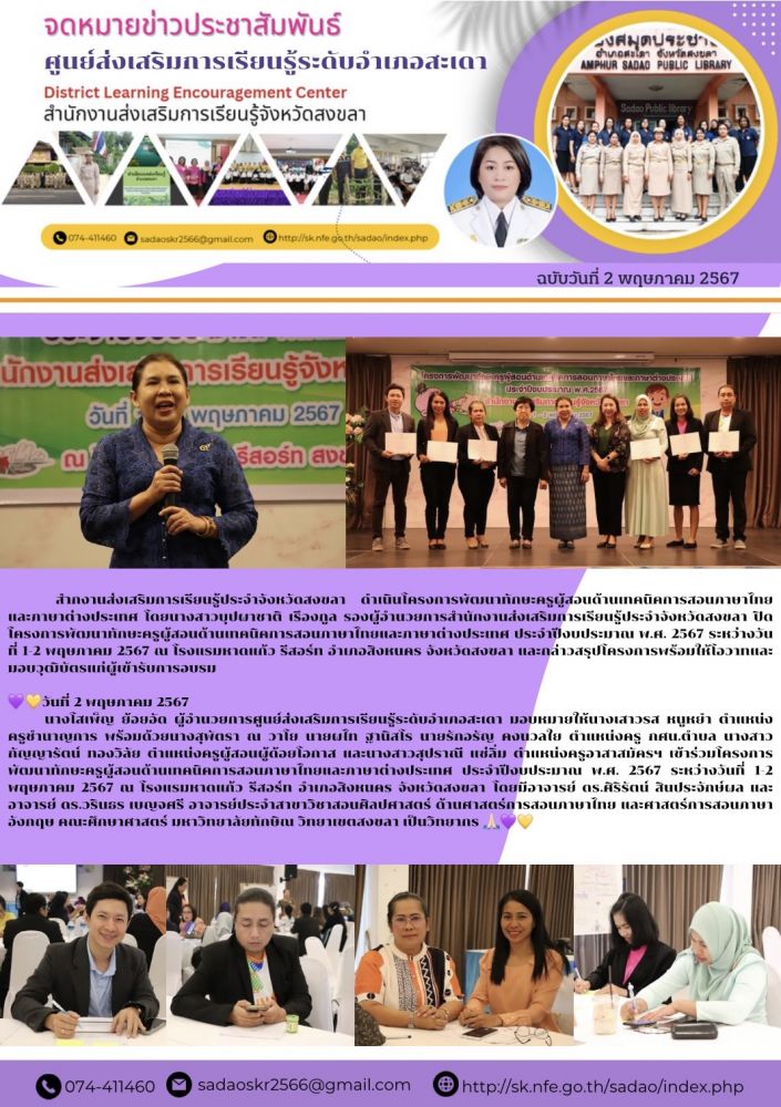 ศูนย์ สกร.ระดับอำเภอสะเดา ศูนย์ส่งเสริมการเรียนรู้ระดับอำเภอสะเดา เข้าร่วมโครงการพัฒนาทักษะครูผู้สอนด้านเทคนิคการสอนภาษาไทยและภาษาต่างประเทศ ประจำปีงบประมาณ พ.ศ. 2567 ระหว่างวันที่ 1-2 พฤษภาคม 2567 ณ โรงแรมหาดแก้ว รีสอร์ท อำเภอสิงหนคร จังหวัดสงขลา