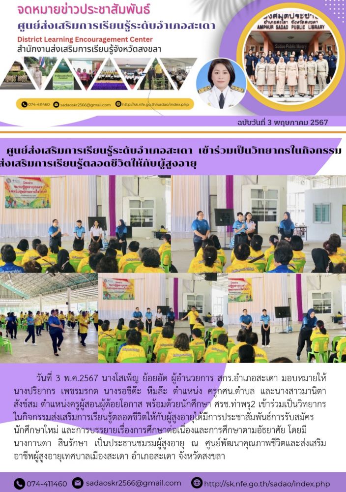 ศูนย์ส่งเสริมการเรียนรู้ระดับอำเภอสะเดา เข้าร่วมเป็นวิทยากรในกิจกรรม ส่งเสริมการเรียนรู้ตลอดชีวิตให้กับผู้สูงอายุ