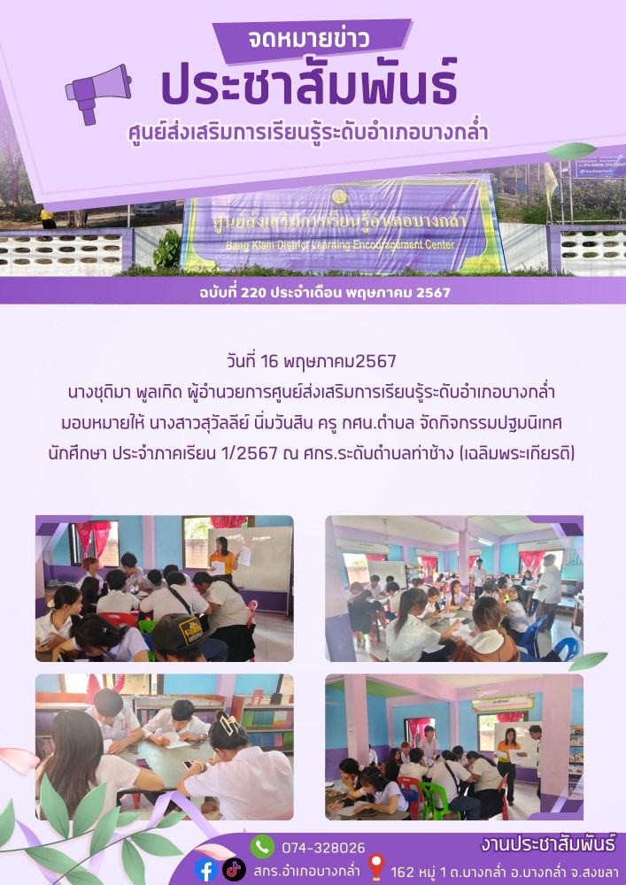 จัดกระบวนการเรียนรู้รายวิชา สังคมศึกษา ระดับมัธยมศึกษาตอนปลาย ณ ศูนย์การเรียนรู้ระดับตำบลบางกล่ำ 19 / ม.ค. / 2569