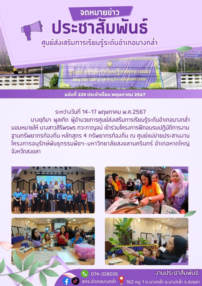 เข้าร่วมการฝึกอบรมปฏิบัติการงานสวนพฤกษศาสตร์โรงเรียน หลักสูตร 5 องค์ประกอบ ระหว่างวันที่ 13-16 มกราคม 2569 ณ ห้องนาฏศิลป์ ชั้น 1 สถาบันวัฒนธรรมศึกษากัลยาณิวัฒนา มหาวิทยาลัยสงขลานครินทร์ วิทยาเขตหาดใหญ่ 19 / ม.ค. / 2569