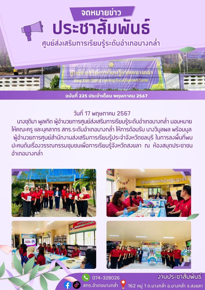 จัดกระบวนการเรียนรู้รายวิชา สังคมศึกษา ระดับมัธยมศึกษาตอนปลาย ณ ศูนย์การเรียนรู้ระดับตำบลบางกล่ำ 19 / ม.ค. / 2569