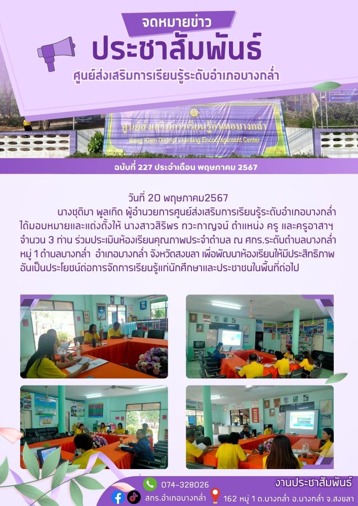 ประเมินห้องเรียนคุณภาพประจำตำบล ณ ศกร.ระดับตำบลบางกล่ำ