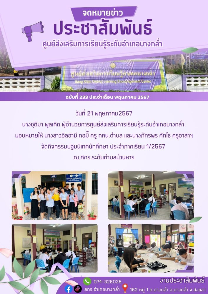 จัดกระบวนการเรียนรู้รายวิชา สังคมศึกษา ระดับมัธยมศึกษาตอนปลาย ณ ศูนย์การเรียนรู้ระดับตำบลบางกล่ำ 19 / ม.ค. / 2569