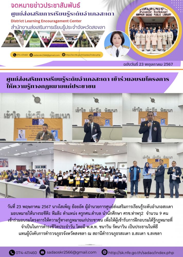 ศูนย์ส่งเสริมการเรียนรู้ระดับอำเภอสะเดา เข้าร่วมอบรมโครงการ ให้ความรู้ทางกฎหมายแก่ประชาชน
