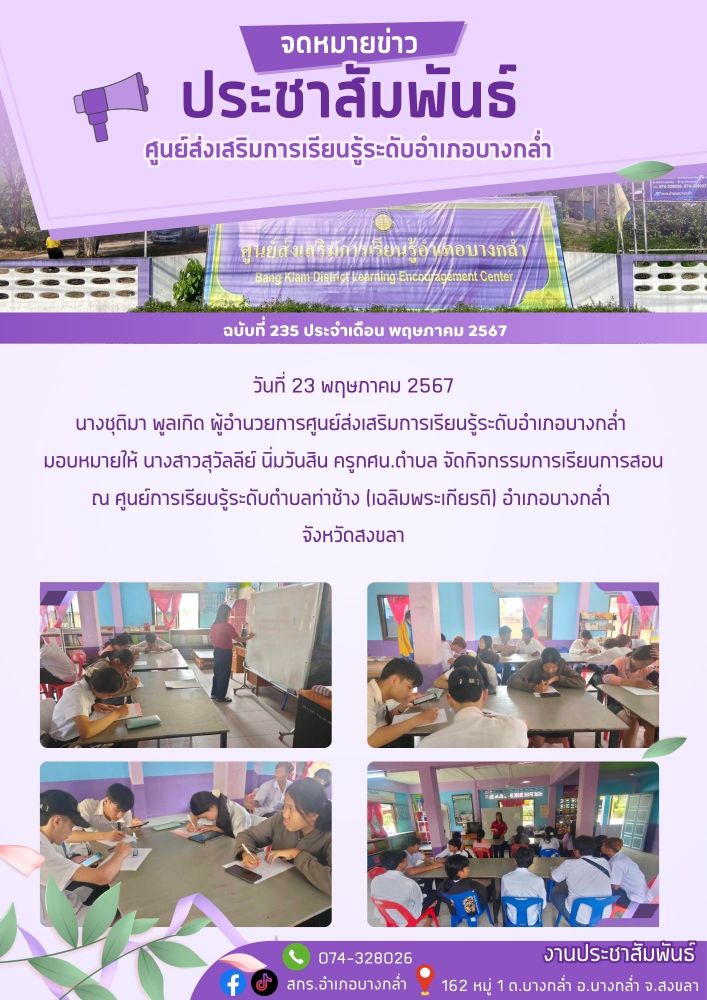 จัดกระบวนการเรียนรู้รายวิชา สังคมศึกษา ระดับมัธยมศึกษาตอนปลาย ณ ศูนย์การเรียนรู้ระดับตำบลบางกล่ำ 19 / ม.ค. / 2569