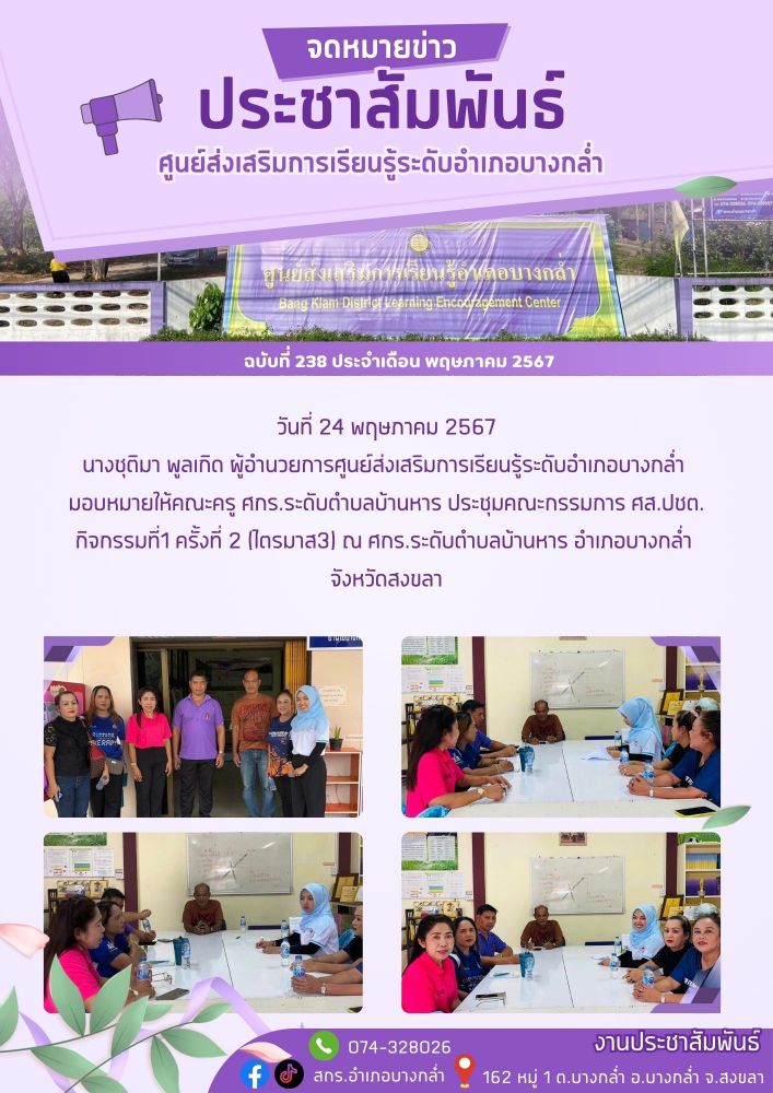 จัดกระบวนการเรียนรู้รายวิชา สังคมศึกษา ระดับมัธยมศึกษาตอนปลาย ณ ศูนย์การเรียนรู้ระดับตำบลบางกล่ำ 19 / ม.ค. / 2569