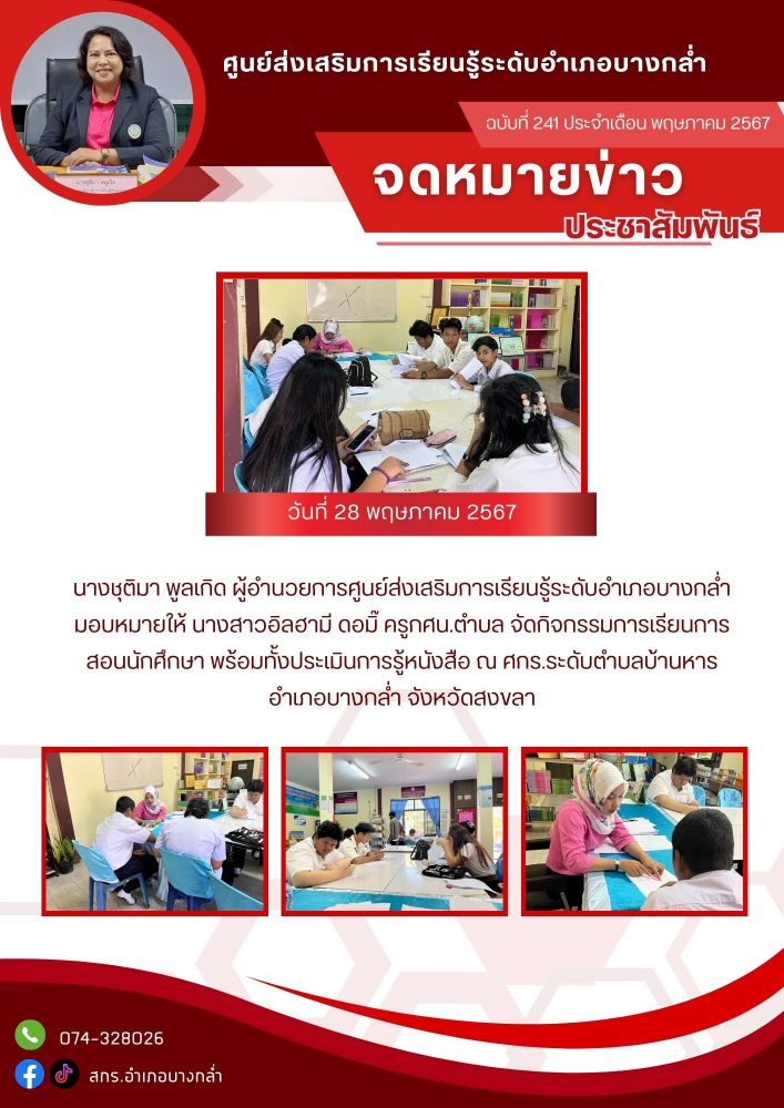 จัดกระบวนการเรียนรู้รายวิชา สังคมศึกษา ระดับมัธยมศึกษาตอนปลาย ณ ศูนย์การเรียนรู้ระดับตำบลบางกล่ำ 19 / ม.ค. / 2569