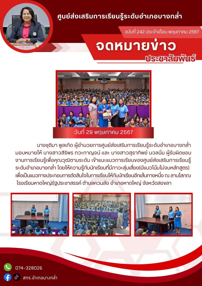 แนะแนวการเรียนของศูนย์ส่งเสริมการเรียนรู้ระดับอำเภอบางกล่ำ โดยให้ความรู้กับนักเรียนที่มีภาวะสุ่มเสี่ยง