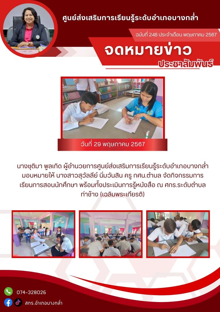 จัดกระบวนการเรียนรู้รายวิชา สังคมศึกษา ระดับมัธยมศึกษาตอนปลาย ณ ศูนย์การเรียนรู้ระดับตำบลบางกล่ำ 19 / ม.ค. / 2569