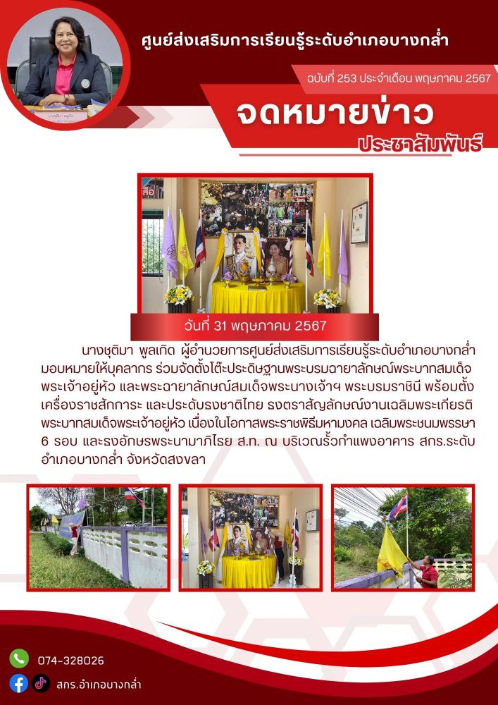 จัดตั้งโต๊ะประดิษฐานพระบรมฉายาลักษณ์พระบาทสมเด็จพระเจ้าอยู่หัว และพระฉายาลักษณ์สมเด็จพระนางเจ้าฯ พระบรมราชินี พร้อมตั้งเครื่องราชสักการะ