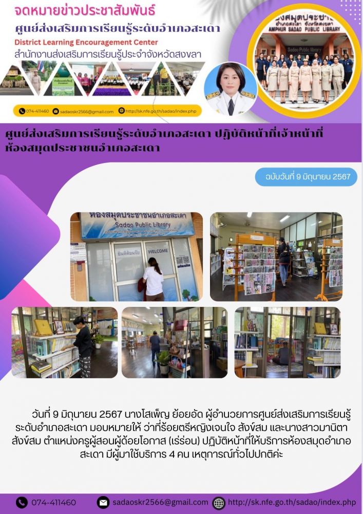 ศูนย์ส่งเสริมการเรียนรู้ระดับอำเภอสะเดา ปฏิบัติหน้าที่เจ้าหน้าที่ ห้องสมุดประชาชนอำเภอสะเดา
