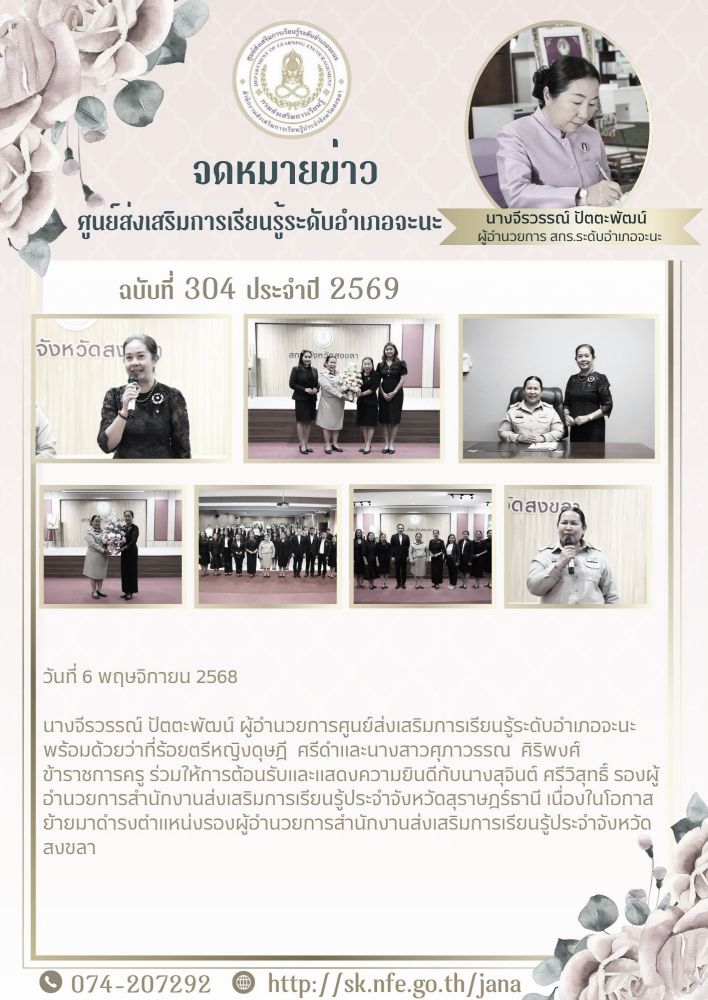 วันที่ 6 พฤศจิกายน 2568 นางจีรวรรณ์ ปัตตะพัฒน์ ผู้อำนวยการศูนย์ส่งเสริมการเรียนรู้ระดับอำเภอจะนะ พร้อมด้วยว่าที่ร้อยตรีหญิงดุษฎี ศรีดำ และนางสาวศุภาวรรณ ศิริพงศ์ ข้าราชการครู ร่วมต้อนรับและเเสดงความยินดีกับนางสุจินต์ ศรีวิสุทธิ์ รองผู้อำนวยการสำนักงานส่งเสริมการเรียนรู้ประจำจังหวัดสุราษฎร์ธานี เนื่องในโอกาสย้ายมาดำรงตำแหน่งรองผู้อำนวยการสำนักงานส่งเสริมการเรียนรู้ประจำจังหวัดสงขลา