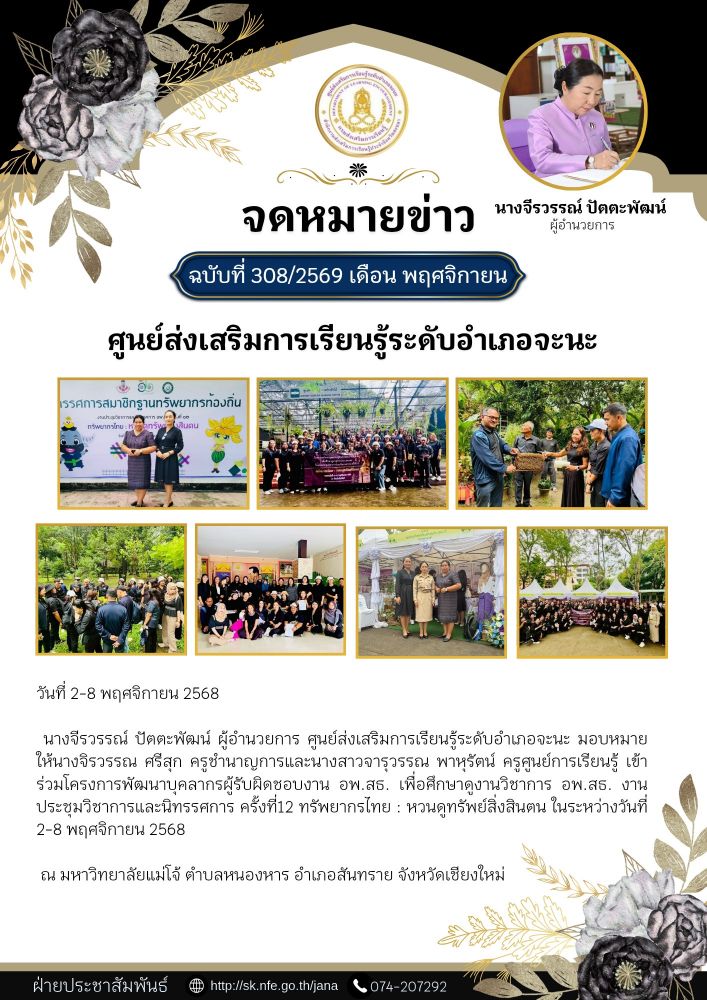 วันที่ 2-8 พฤศจิกายน 2568 นางจีรวรรณ์ ปัตตะพัฒน์ ผู้อำนวยการศูนย์ส่งเสริมการเรียนรู้ระดับอำเภอจะนะ มอบหมายให้นางจิรวรรณ ศรีสุก ครูชำนาญการและนางสาวจารุวรรณ พาหุรัตน์ ครูศูนย์การเรียนรู้ เข้าร่วมโครงการพัฒนาบุคลากรผู้รับผิดชอบงาน อพ.สธ. เพื่อศึกษาดูงานวิชาการ อพ.สธ. งานประชุมวิชาการและนิทรรศการ ครั้งที่12 ทรัพยากรไทย : หวนดูทรัพย์สิ่งสินตน ในระหว่างวันที่ 2-8 พฤศจิกายน 2568 ณ มหาวิทยาลัยแม่โจ้ ตำบลหนองหาร อำเภอสันทราย จังหวัดเชียงใหม่