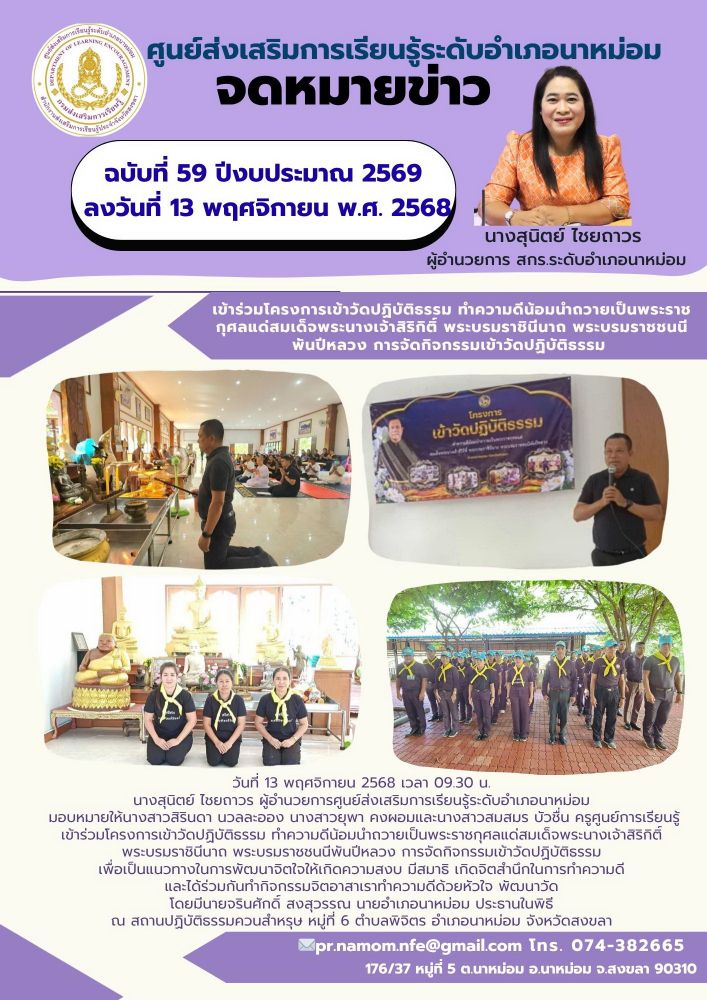 นางสุนิตย์ ไชยถาวร ผู้อำนวยการศูนย์ส่งเสริมการเรียนรู้ระดับอำเภอนาหม่อม มอบหมายให้นางสาวสิรินดา นวลละออง นางสาวยุพา คงผอมและนางสาวสมสมร บัวชื่น ครูศูนย์การเรียนรู้ เข้าร่วมโครงการเข้าวัดปฏิบัติธรรม ทำความดีน้อมนำถวายเป็นพระราชกุศลแด่สมเด็จพระนางเจ้าสิริกิติ์ พระบรมราชินีนาถ พระบรมราชชนนีพันปีหลวง การจัดกิจกรรมเข้าวัดปฏิบัติธรรม เพื่อเป็นแนวทางในการพัฒนาจิตใจให้เกิดความสงบ มีสมาธิ เกิดจิตสำนึกในการทำความดี และได้ร่วมกันทำกิจกรรมจิตอาสาเราทำความดีด้วยหัวใจ พัฒนาวัด