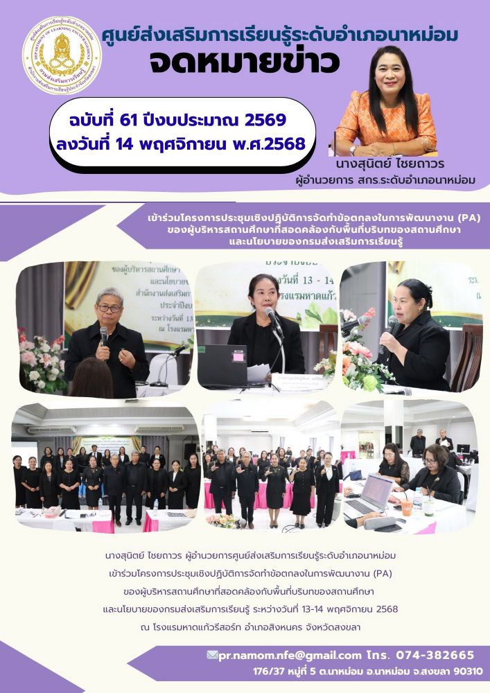 นางสุนิตย์ ไชยถาวร ผู้อำนวยการศูนย์ส่งเสริมการเรียนรู้ระดับอำเภอนาหม่อม เข้าร่วมโครงการประชุมเชิงปฏิบัติการจัดทำข้อตกลงในการพัฒนางาน (PA) ของผู้บริหารสถานศึกษาที่สอดคล้องกับพื้นที่บริบทของสถานศึกษา และนโยบายของกรมส่งเสริมการเรียนรู้ ระหว่างวันที่ 13-14 พฤศจิกายน 2568