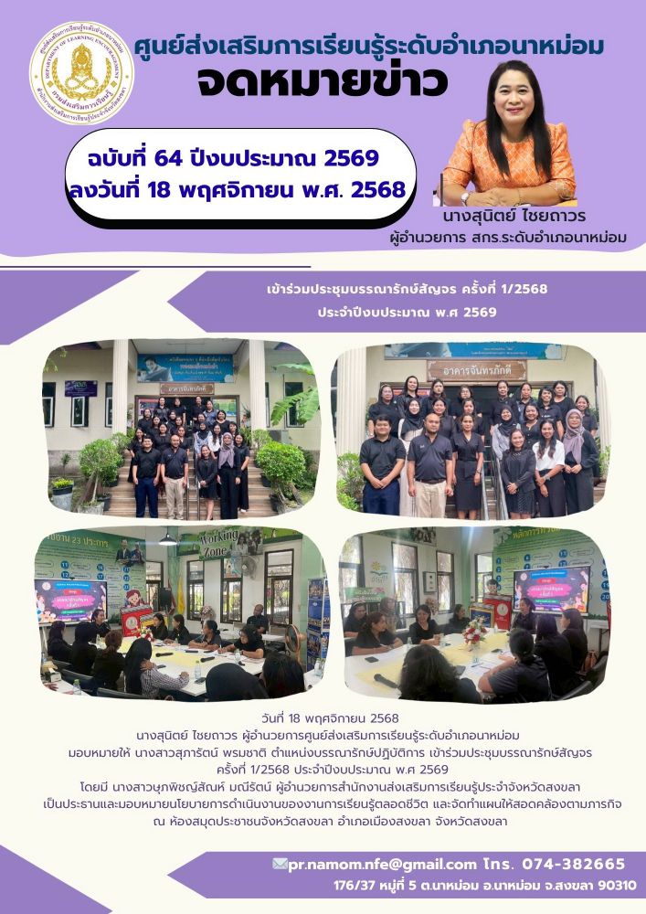 นางสุนิตย์ ไชยถาวร ผู้อำนวยการศูนย์ส่งเสริมการเรียนรู้ระดับอำเภอนาหม่อม มอบหมายให้ นางสาวสุภารัตน์ พรมชาติ ตำแหน่งบรรณารักษ์ปฏิบัติการ เข้าร่วมประชุมบรรณารักษ์สัญจร ครั้งที่ 1/2568 ประจำปีงบประมาณ พ.ศ 2569