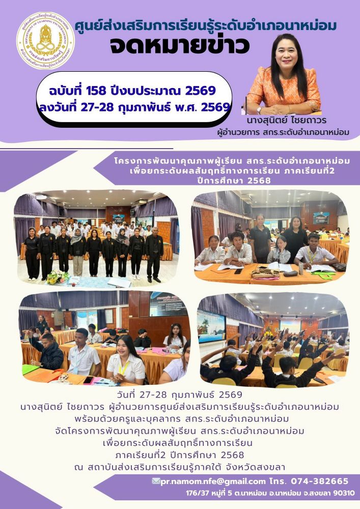 นางสุนิตย์ ไชยถาวร ผู้อำนวยการศูนย์ส่งเสริมการเรียนรู้ระดับอำเภอนาหม่อม พร้อมด้วยครูและบุคลากร สกร.ระดับอำเภอนาหม่อม จัดโครงการพัฒนาคุณภาพผู้เรียน สกร.ระดับอำเภอนาหม่อม เพื่อยกระดับผลสัมฤทธิ์ทางการเรียน ภาคเรียนที่2 ปีการศึกษา 2568