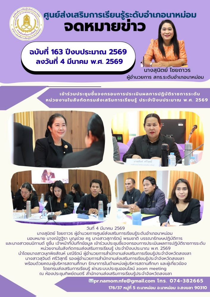 นางสุนิตย์ ไชยถาวร ผู้อำนวยการศูนย์ส่งเสริมการเรียนรู้ระดับอำเภอนาหม่อม มอบหมาย นางณัฐฐิรา บุญช่วย ครู นางสาวสุภารัตน์ พรมชาติ บรรณารักษษปฏิบัติการ และนางสาวชนนิกานต์ ชูชื่น เจ้าหน้าที่บันทึกข้อมูล เข้าร่วมประชุมชี้แจงกรอบการประเมินผลการปฏิบัติราชการระดับหน่วยงานในสังกัดกรมส่งเสริมการเรียนรู้ ประจำปีงบประมาณ พ.ศ. 2569