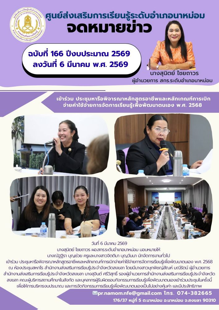 นางสุนิตย์ ไชยถาวร ผอ.สกร.ระดับอำเภอนาหม่อม มอบหมายให้ นางณัฐฐิรา บุญช่วย ครูและนางสาวจิตติมา บุญวันนา นักจัดการงานทั่วไปเจ้าร่วม ประชุมหารือพิจารณาหลักสูตรอาชีพและหลักเกณฑ์การเบิกจ่ายค่าใช้จ่ายการจัดการเรียนรู้เพื่อพัฒนาตนเอง พ.ศ. 2568