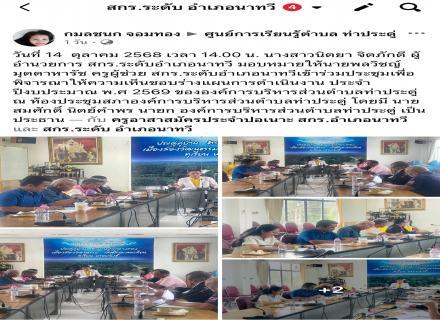 วันที่ 14 ตุลาคม 2568 เวลา 14.00 น. นางสาวนิตยา จิตภักดี ผู้อำนวยการ สกร.ระดับอำเภอนาทวี มอบหมายให้นายพลวิชญ์ มุตตาหารัช ครูผู้ช่วย สกร.ระดับอำเภอนาทวีเข้าร่วมประชุมเพื่อพิจารณาให้ความเห็นชอบร่างแผนการดำเนินงาน ประจำปีงบประมาณ พ.ศ 2569 ขององค์การบริหารส่