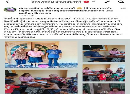 วันที่ 14 ตุลาคม 2568 เวลา 15.30 -17.00 น. นางสาวนิตยา จิตภักดี ผู้อำนวยการศูนย์ส่งเสริมการเรียนรู้ระดับอำเภอนาทวี มอบหมายให้นางสาวสุภิศรา บุญช่วย ครูศกร.ระดับตำบลปลักหนู ลงพื้นที่สำรวจข้อมูลเด็กและเยาวชนนอกระบบการศึกษา Zero Dropout หมู่ที่ 5,7 ตำบล