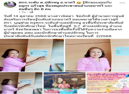 วันที่ 14 ตุลาคม 2568 นางสาวนิตยา จิตภักดี ผู้อำนวยการศูนย์ส่งเสริมการเรียนรู้ระดับอำเภอนาทวี มอบหมายให้นางสาวสุภิศรา บุญช่วย ครูศกร.ระดับตำบลปลักหนู ลงพื้นที่ประชาสัมพันธ์รับสมัครนักศึกษาใหม่ ในพื้นที่หมู่ที่ 5,7 ตำบลปลักหนู อำเภอนาทวี จังหวัดสงขลา