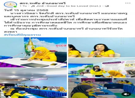 วันที่ 15 ตุลาคม 2568 นางสาวนิตยา จิตภักดี สกร.ระดับอำเภอนาทวี มอบหมายครูและบุคลากร สกร.ระดับอำเภอนาทวี เข้าร่วมการประชุมประจำสัปดาห์ เพื่อติดตามงานตามแผนที่ได้ดำเนินงาน การศึกษาตลอดชีวิต การศึกษาเพื่อพัฒนาตนเอง การศึกษาคุณวุฒิตามระดับ ณ ห