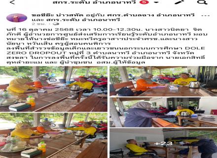 นที่ 16 ตุลาคม 2568 เวลา 10.00-12.30น. นางสาวนิตยา จิตภักดี ผู้อำนวยการศูนย์ส่งเสริมการเรียนรู้ระดับอำเภอนาทวี มอบหมายให้นางข่อซีย๊ะ หมะหวีครูอาสาฯประจำศรช.และนางสาวนัยนา หวันเส็น ครูผู้สอนคนพิการ ลงพื้นที่สำรวจข้อมูลเด็กและเยาวชนนอกระบบการศึกษา DOLE ZER